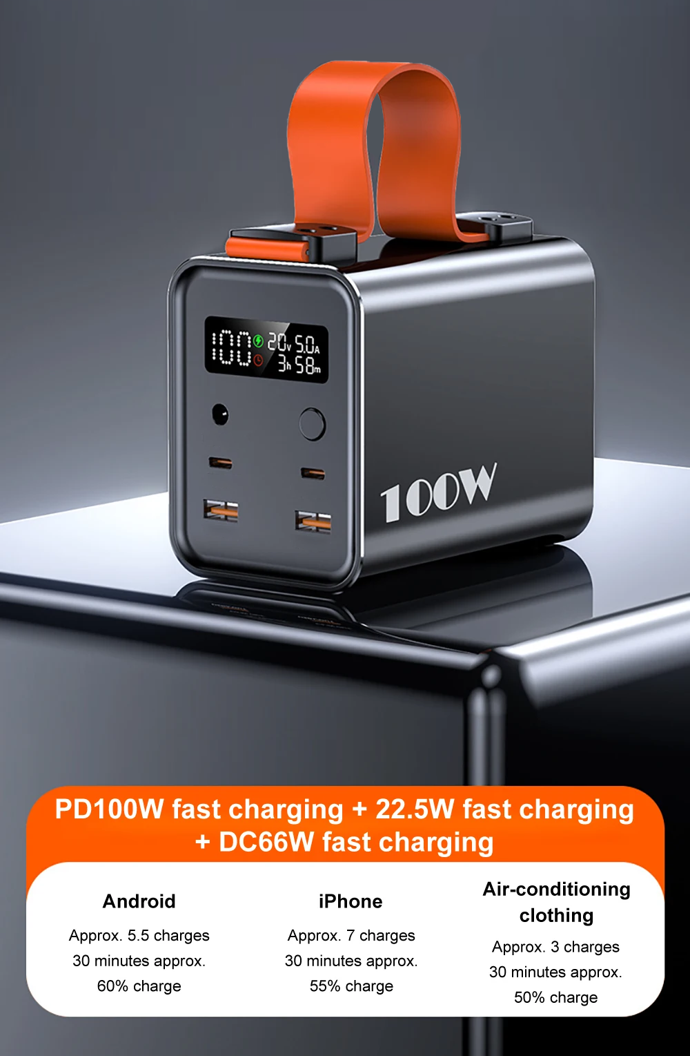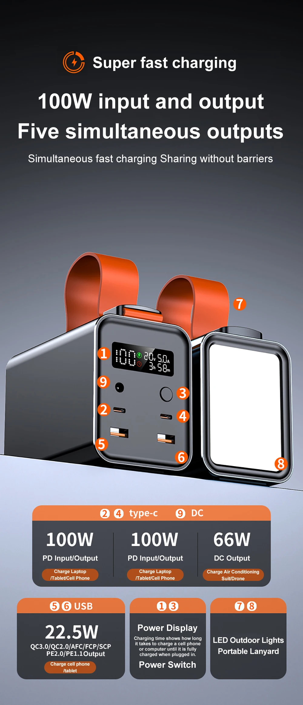 - Type-C 1 Input: 5V/3A, 9V/3.0A, 12V/3.0A, 20V/5A(MAX100W)