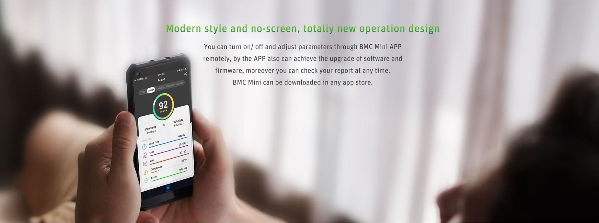 - Smart A/C Modes – Using intelligent pressure adjusting technology, the BMC M1 Mini device can automatically alter the treatment pressure parameters to adapt to the user’s changing lifestyle.