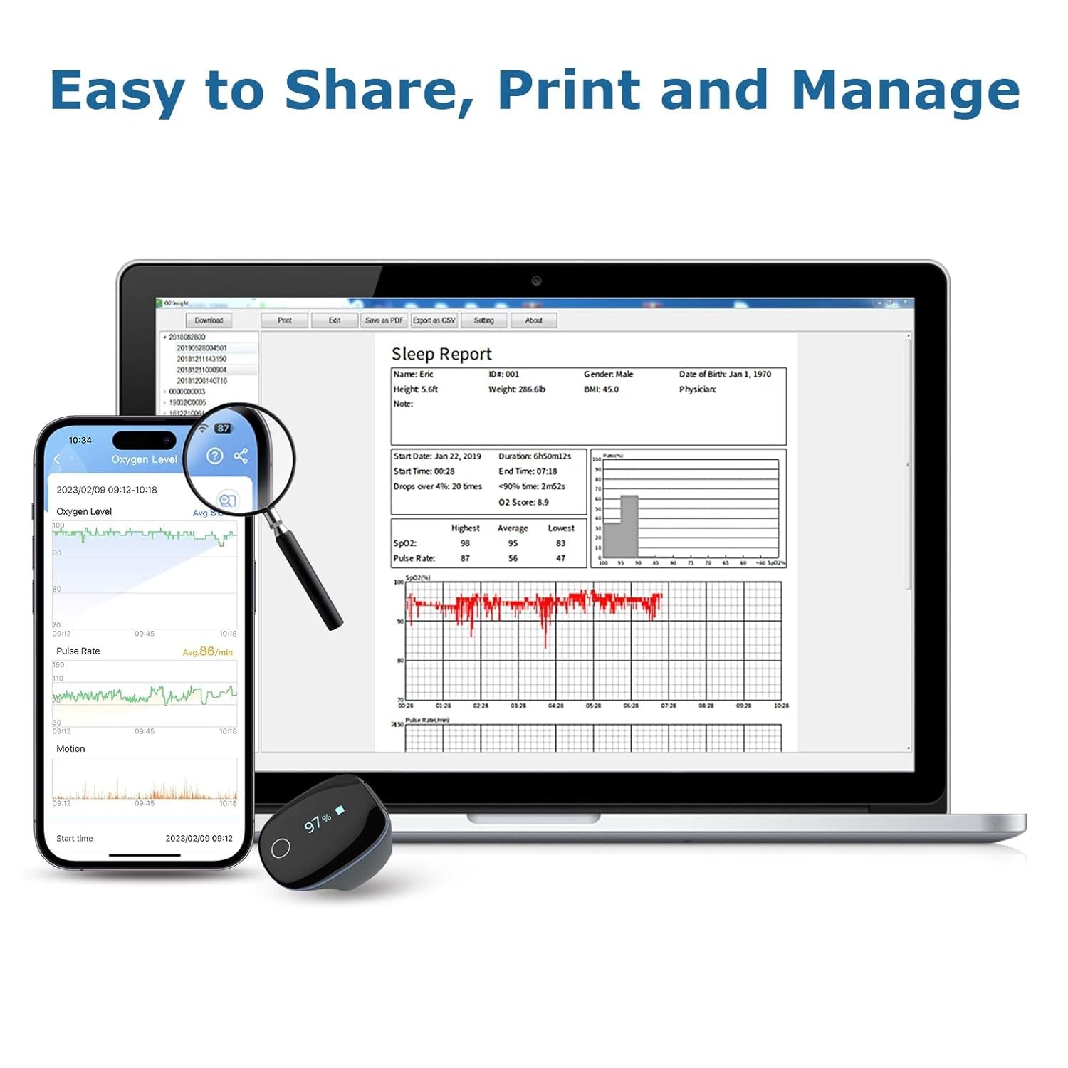 - Comprehensive Reporting: Access detailed analysis and trends of oxygen and pulse readings through our free app and PC software. Export and share reports in PDF and CSV formats. Compatible with iOS (9.0+), iPhone 4s/iPad 3 onwards, Android (5.0+), and Bluetooth 4.0 BLE.